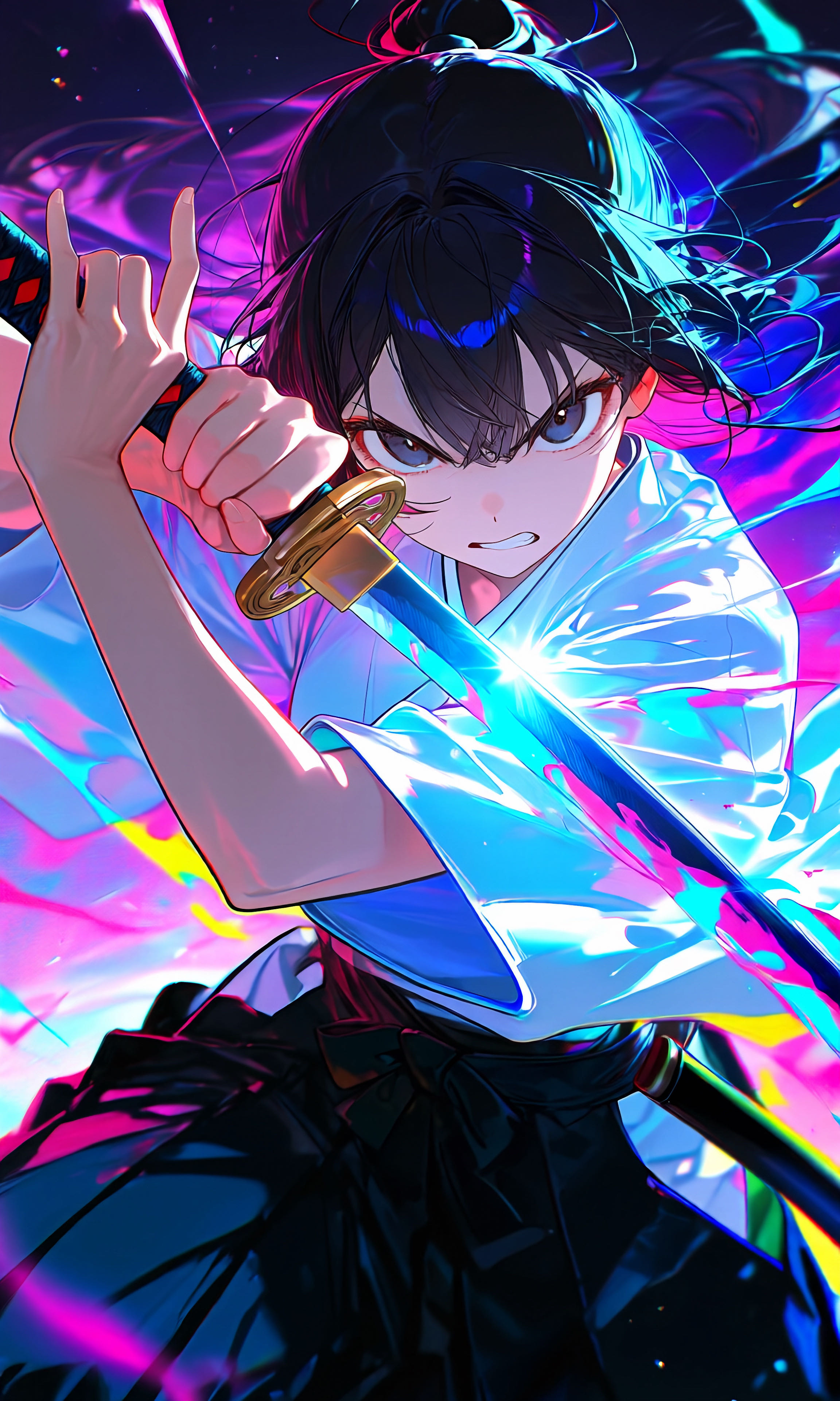 花菱光華(はなびし こうか)/天真正伝香取神道流剣術/黒髪黒眼/根結いの垂髪/道着袴/鬼気迫る表情