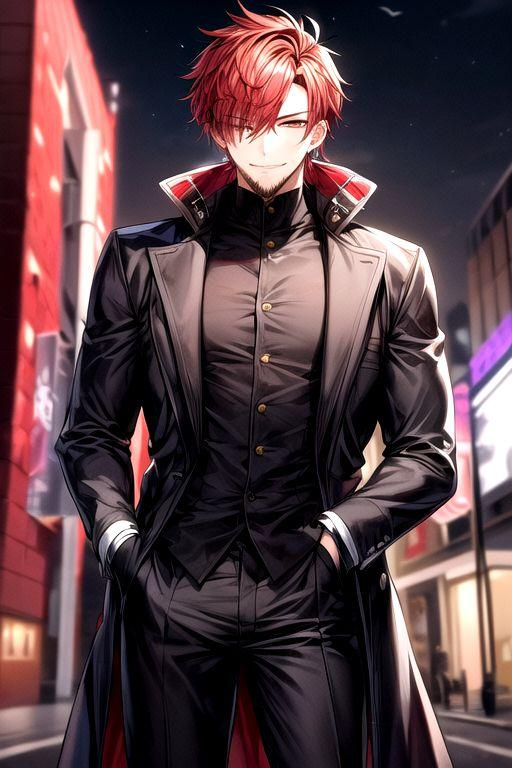 容姿: 赤い髪 パンクなスーツ マッシブ