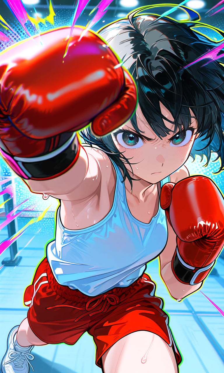 高馬椿(こおま つばき)/ボクサー/黒髪ショート/白のタンクトップ/赤いグローブ/ハードパンチャー