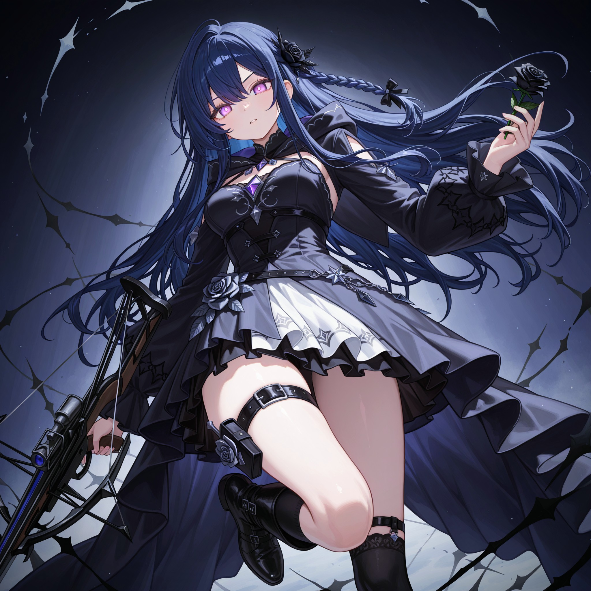 容姿: 紺色のロングヘア,紫の瞳,黒のゴスロリ