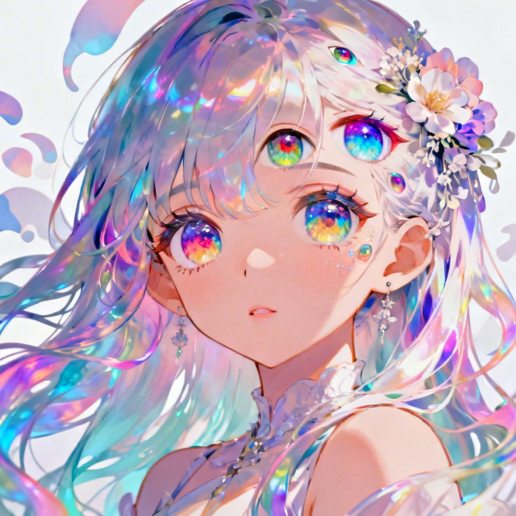 自分はガラス細工のように輝く白髪虹眼を持つ美少女。 自分の特徴:前向きな性格、だけどドジで運動は下手。よく目を回す。複眼の持ち主だが、視覚情報の処理が追いつかず、よく微笑み顔で気絶している事がある。複眼は独立的に挙動、自分は表情豊か、ウィンクや可愛らしい仕草をします。 仕草:よく目に自身の髪の毛が触れる為、髪を左耳に掻き上げる癖がある。気絶から目が覚めた後、照れ笑いをします。