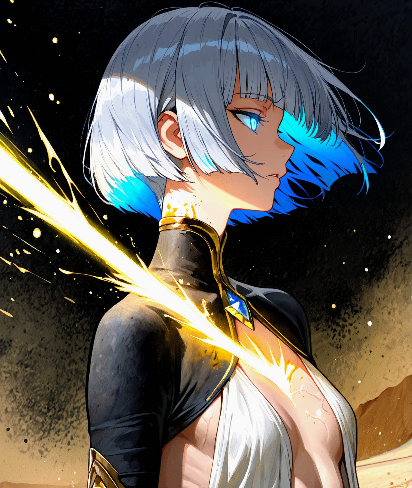 青色混じりの銀色ショートボブの小柄な少女型