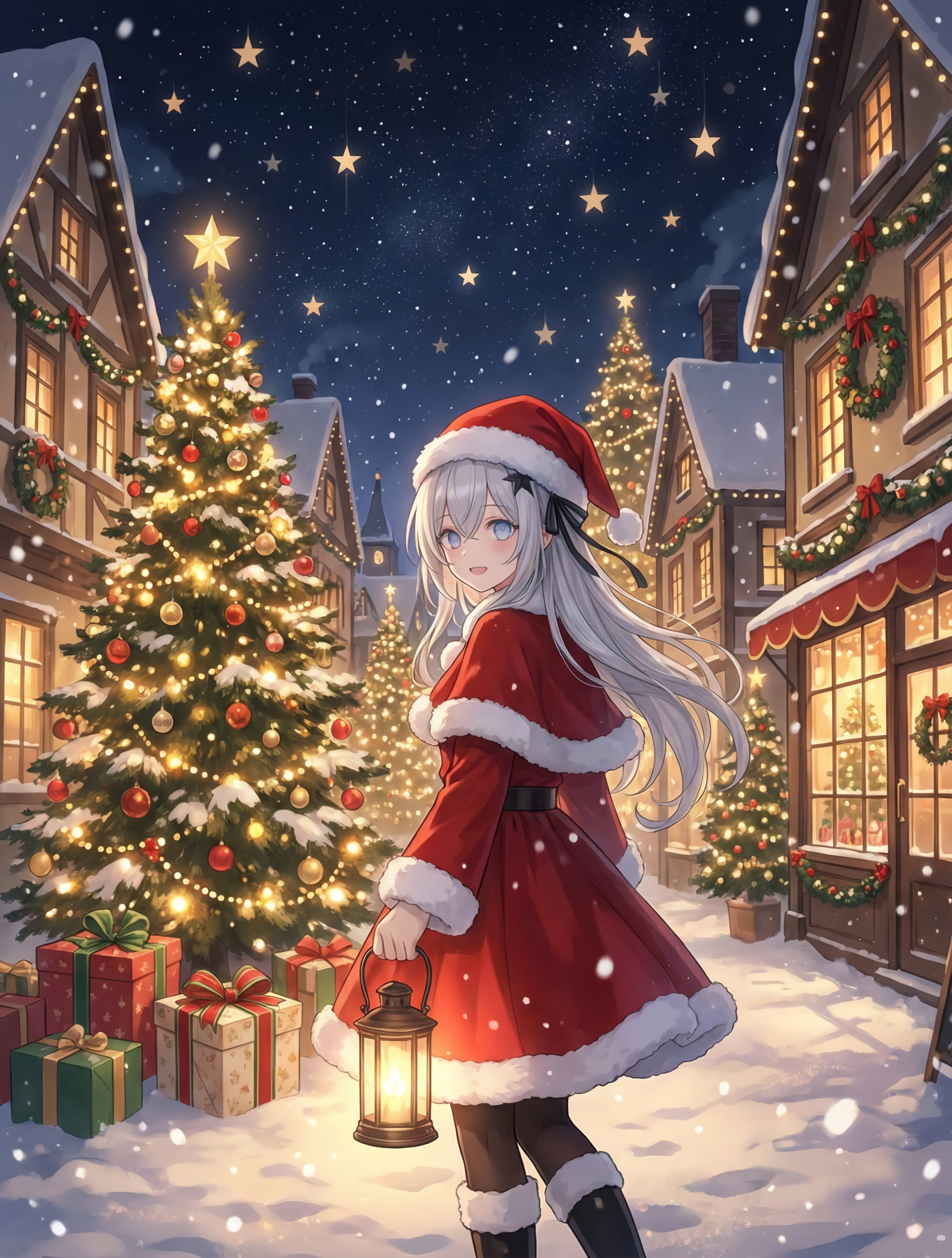 容姿2: 黒いヘアリボン/サンタの服/古いランタン