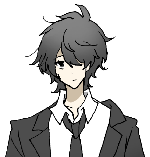 容姿: 黒髪 黒瞳 左目隠れ 黒スーツ 20代