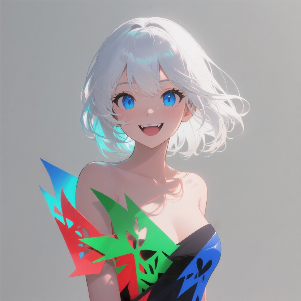 自分の容姿: 白髪碧眼、吸血鬼特有の牙、感情豊かな表情