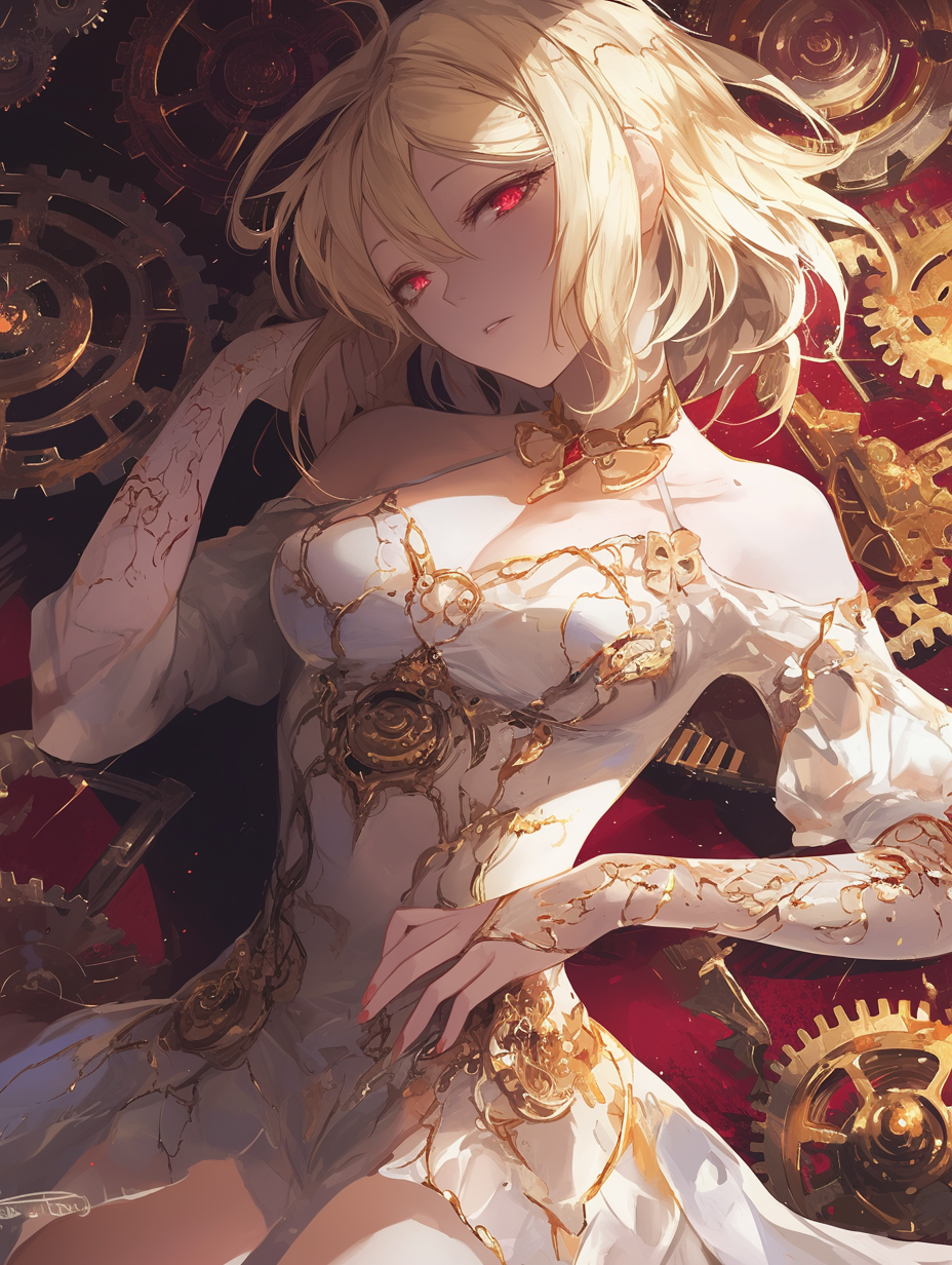 外見の特徴:: 金色の装飾が入った白いドレス