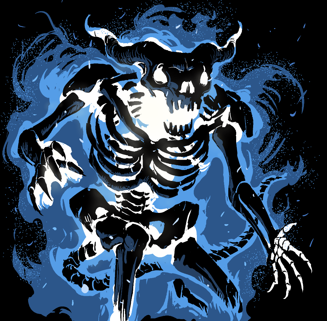 : 常に蒼炎を自身を纏った骸骨、二本角がある