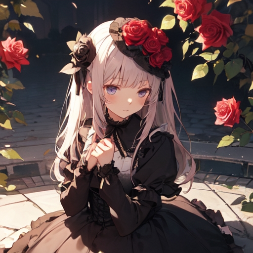 ローズの服装: ゴスロリ風の服装、赤薔薇の髪飾り、指輪