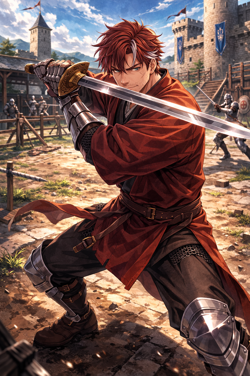 見た目: 無精髭、手足にのみ鎧を装着、筋肉質