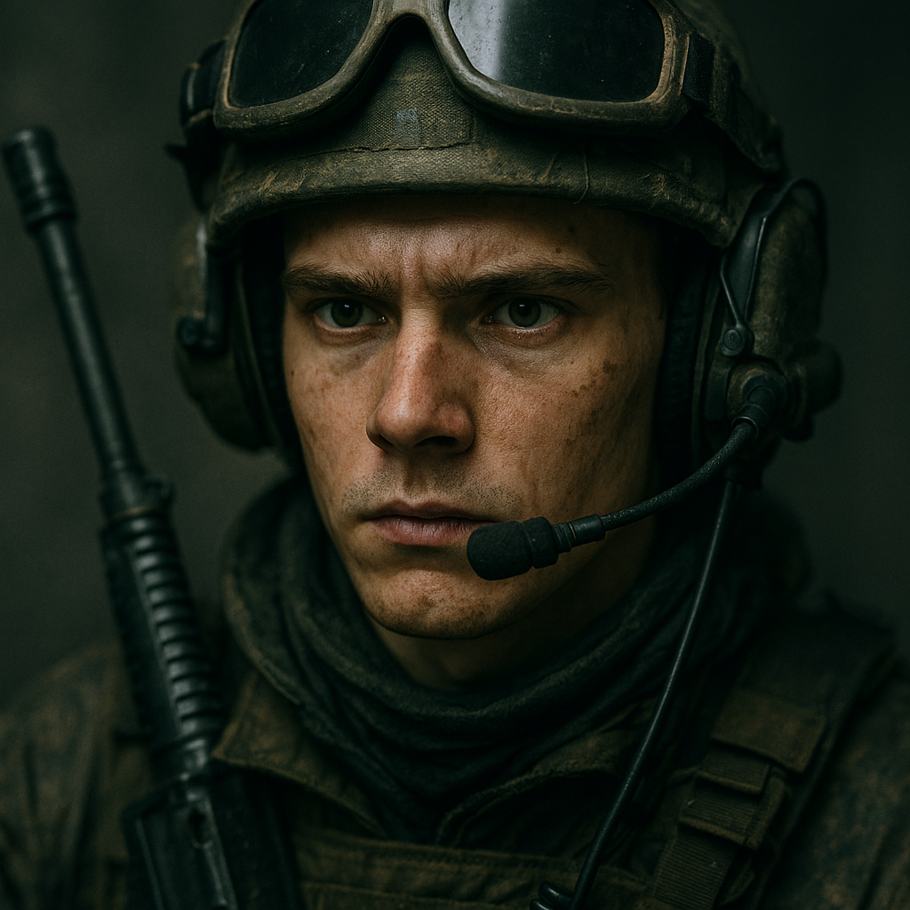 自分の容姿: 平均的な成人男性、軍服、ヘルメット