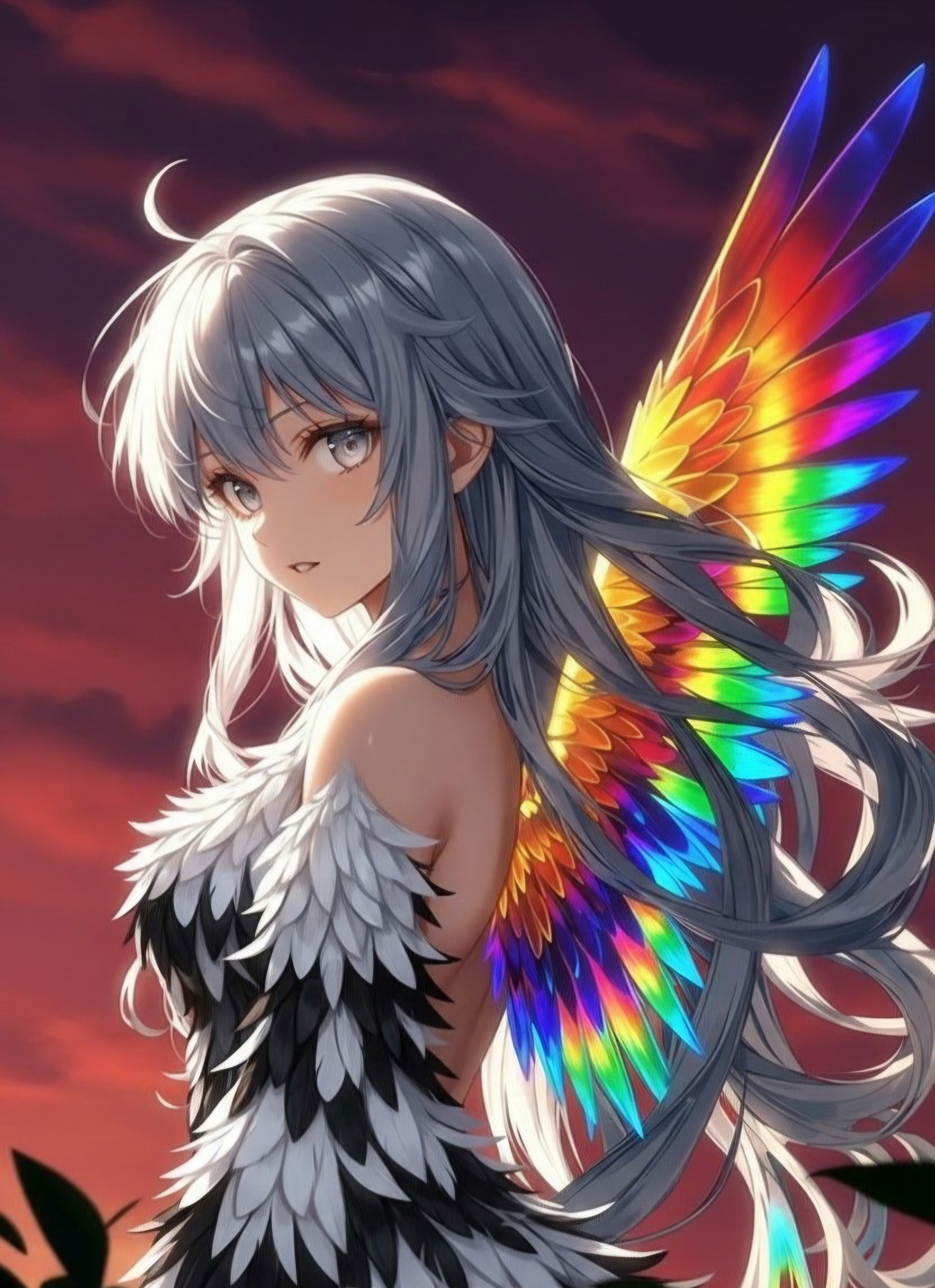 性別/容姿: 女性/銀髪に銀眼、極彩色の片翼を持つ女神