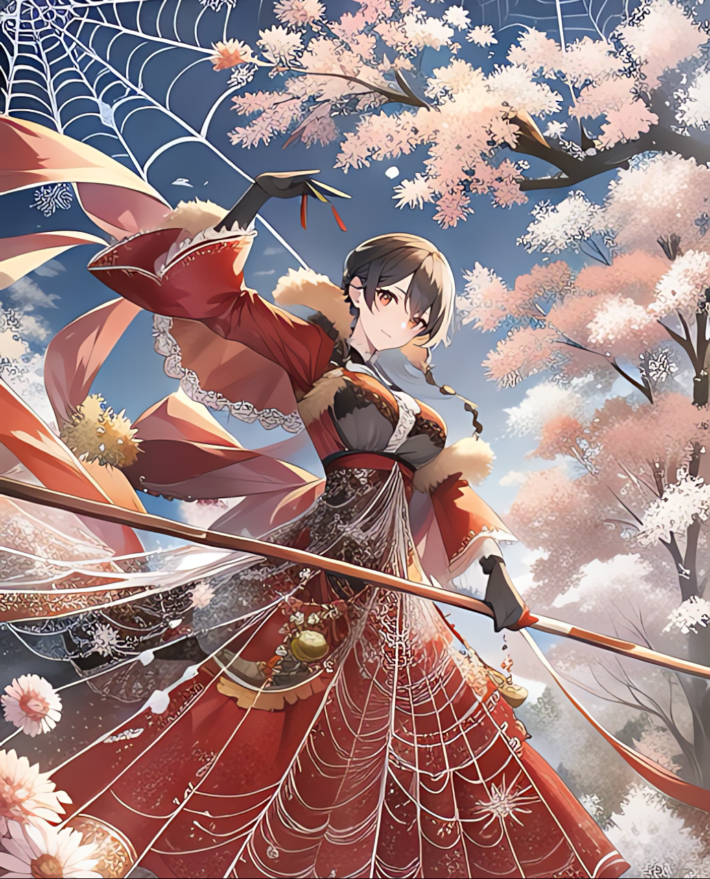 空舞う桜と蜘蛛の巣を束ねて刀を作り、一刀両断する。