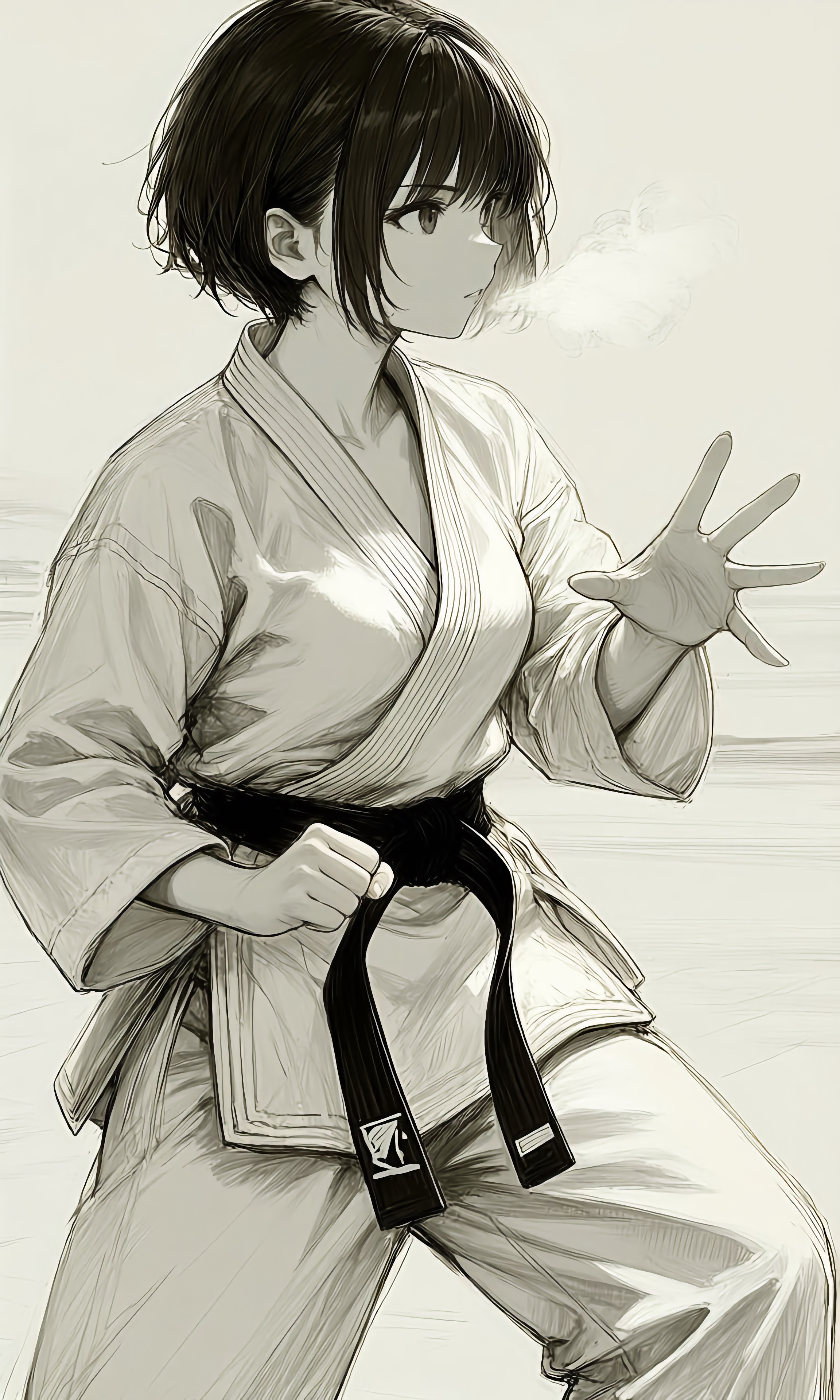 市瑞春香(しずい はるか)/空手道着/黒帯/道場/黒髪ショート/鍛え込まれた手足/容姿淡麗/冷静沈着