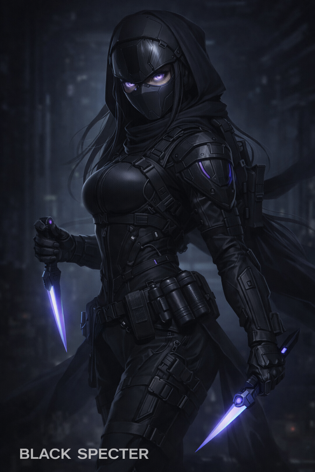 外見: 露出しているのは紫の瞳と黒髪のみ