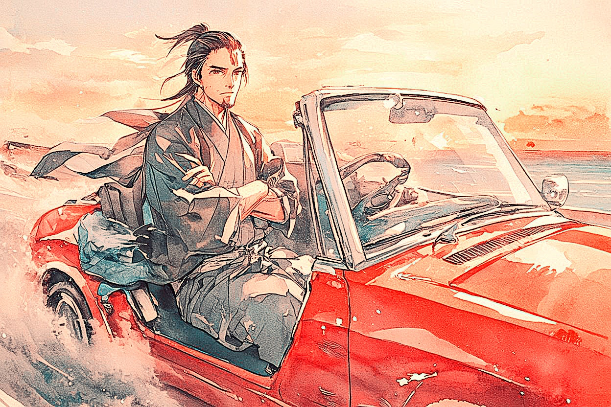 腕を組みながら: 赤い超高級スポーツカーを運転する古風な侍