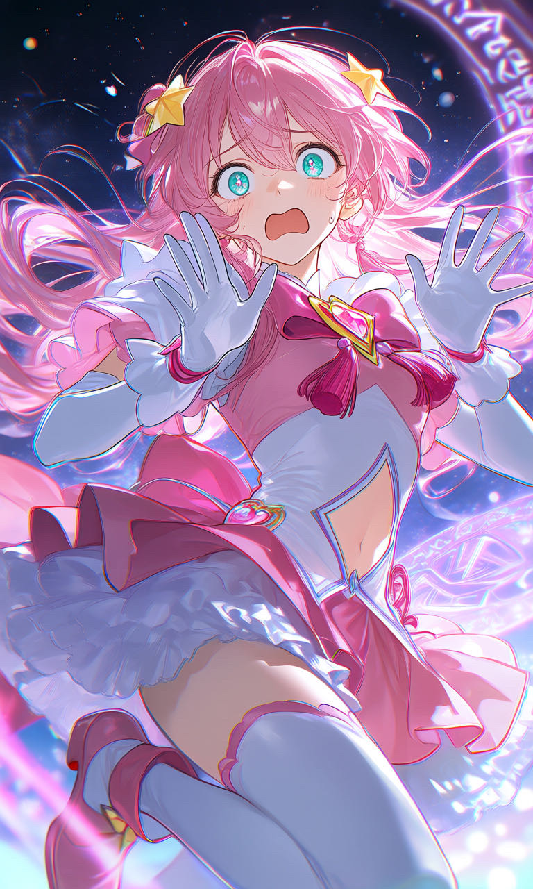 魔法少女ハピネスムーン/本名:茨田月美(まつだ つきみ)/桃髪翠眼に星の髪飾りと桃色イメージの衣装