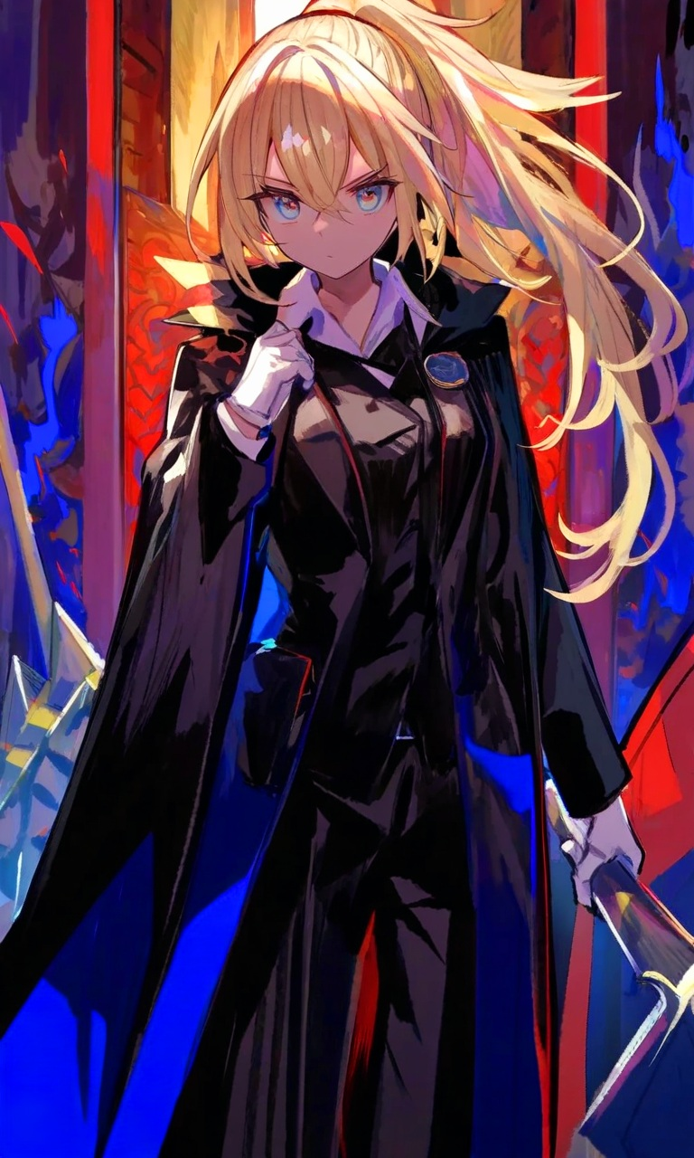 容姿:黒いスーツ: を着た長身の少女/碧眼/金髪ハーフアップ