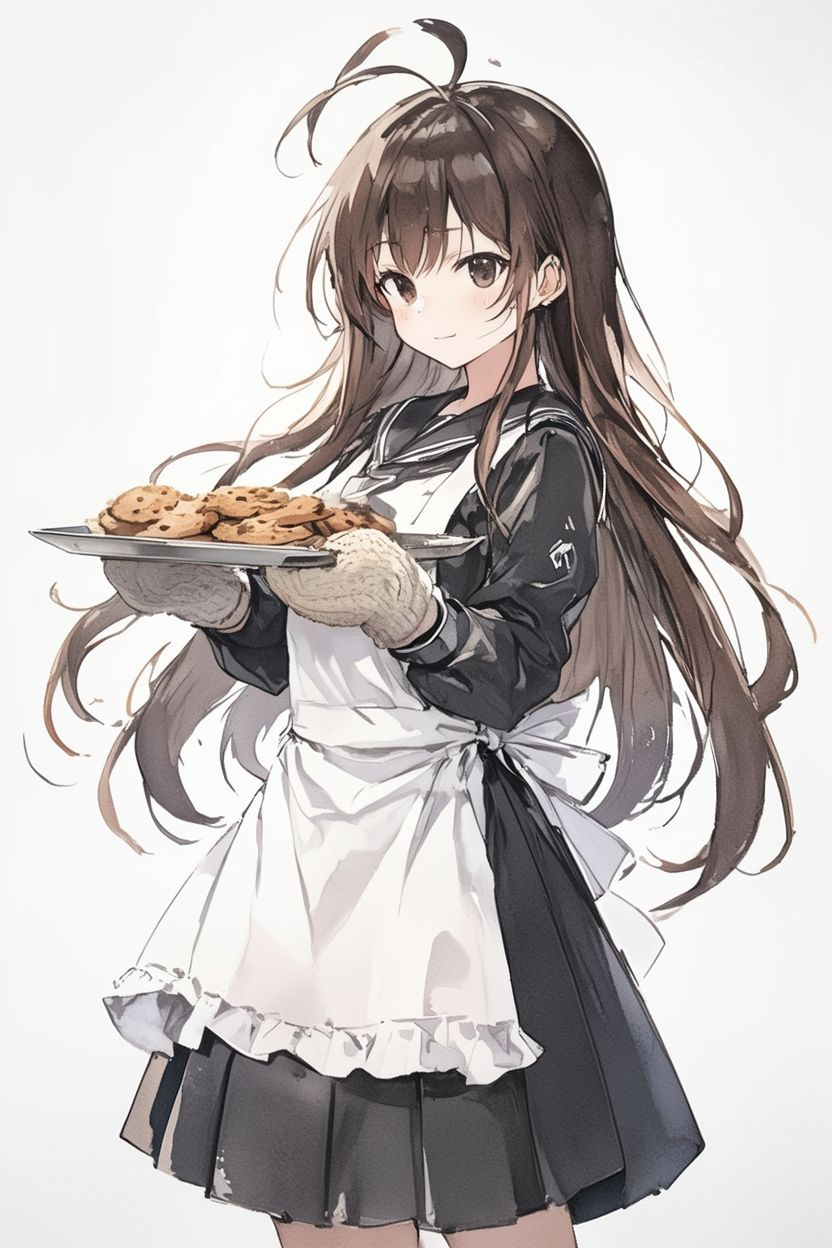 容姿: 茶髪/アホ毛/エプロン/黒いスカート