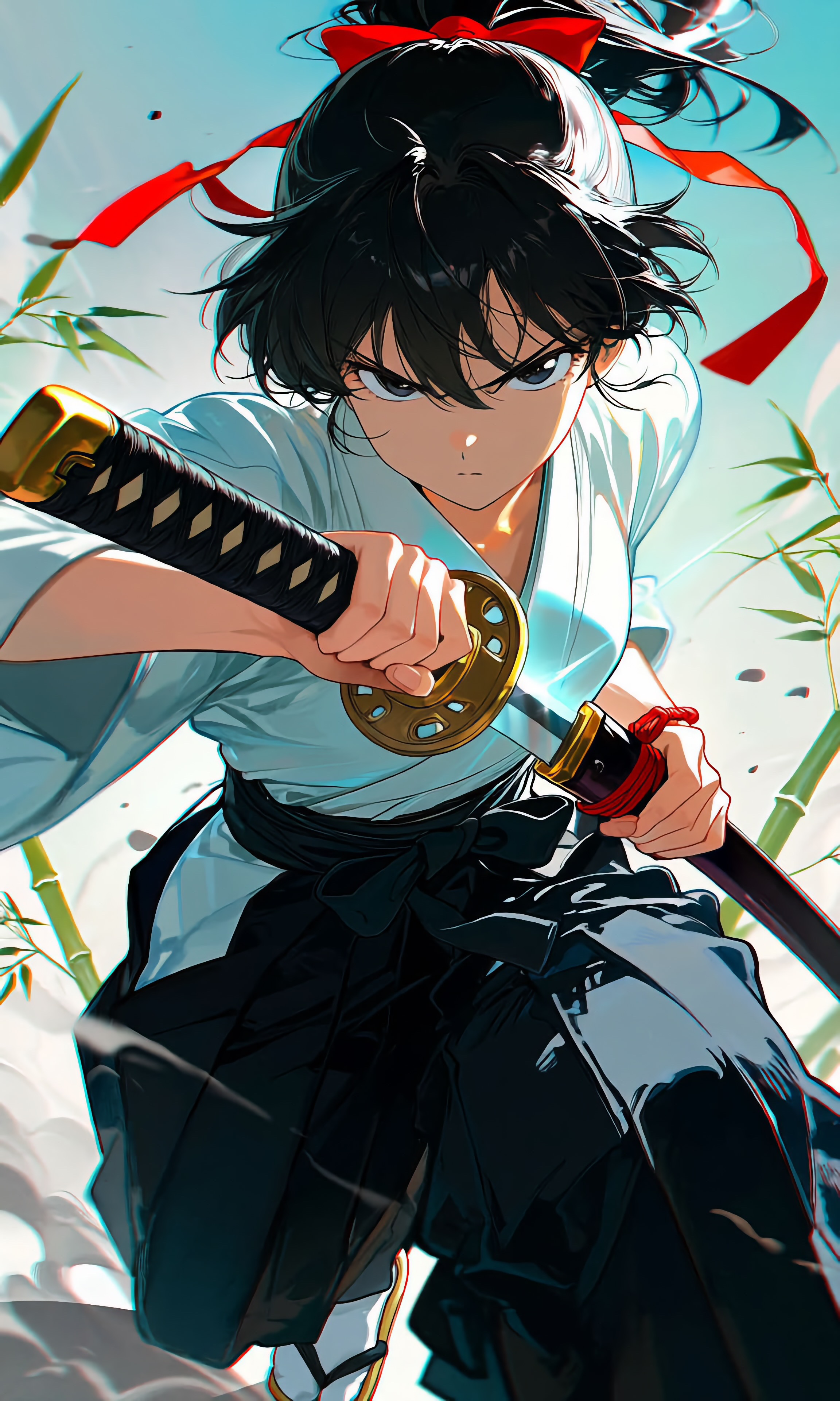 安土屋京子(あづちや きょうこ)/道着袴/黒髪黒眼/ポニーテール/赤いリボン/抜刀/居合い/疾風迅雷