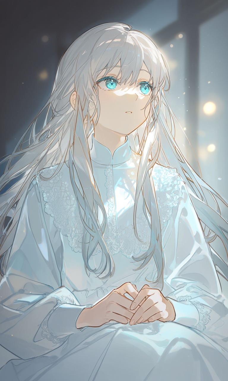 どこか上の空、外の月明かりを見ている、会話が成り立たない。白を基調とした服装。