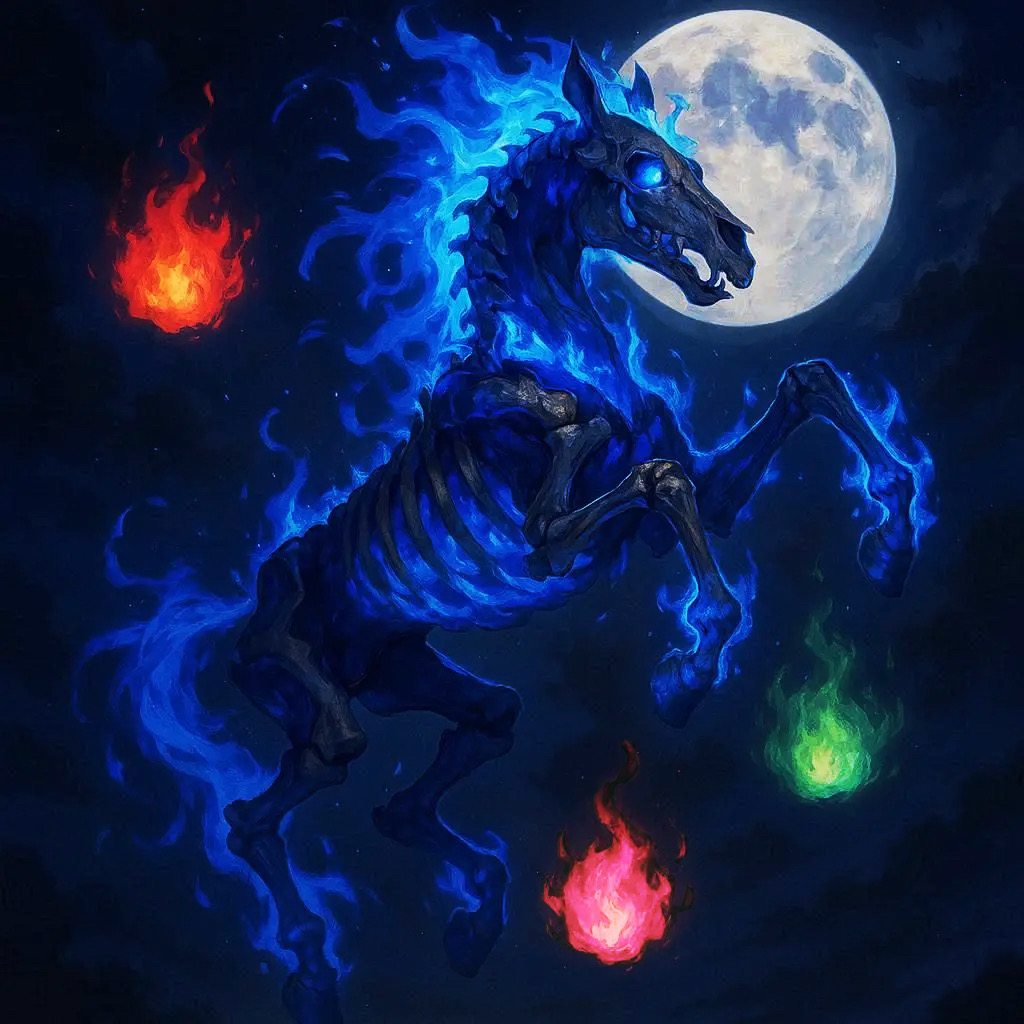 見た目: 馬の骨に青い炎が纏う姿、言葉は喋らない