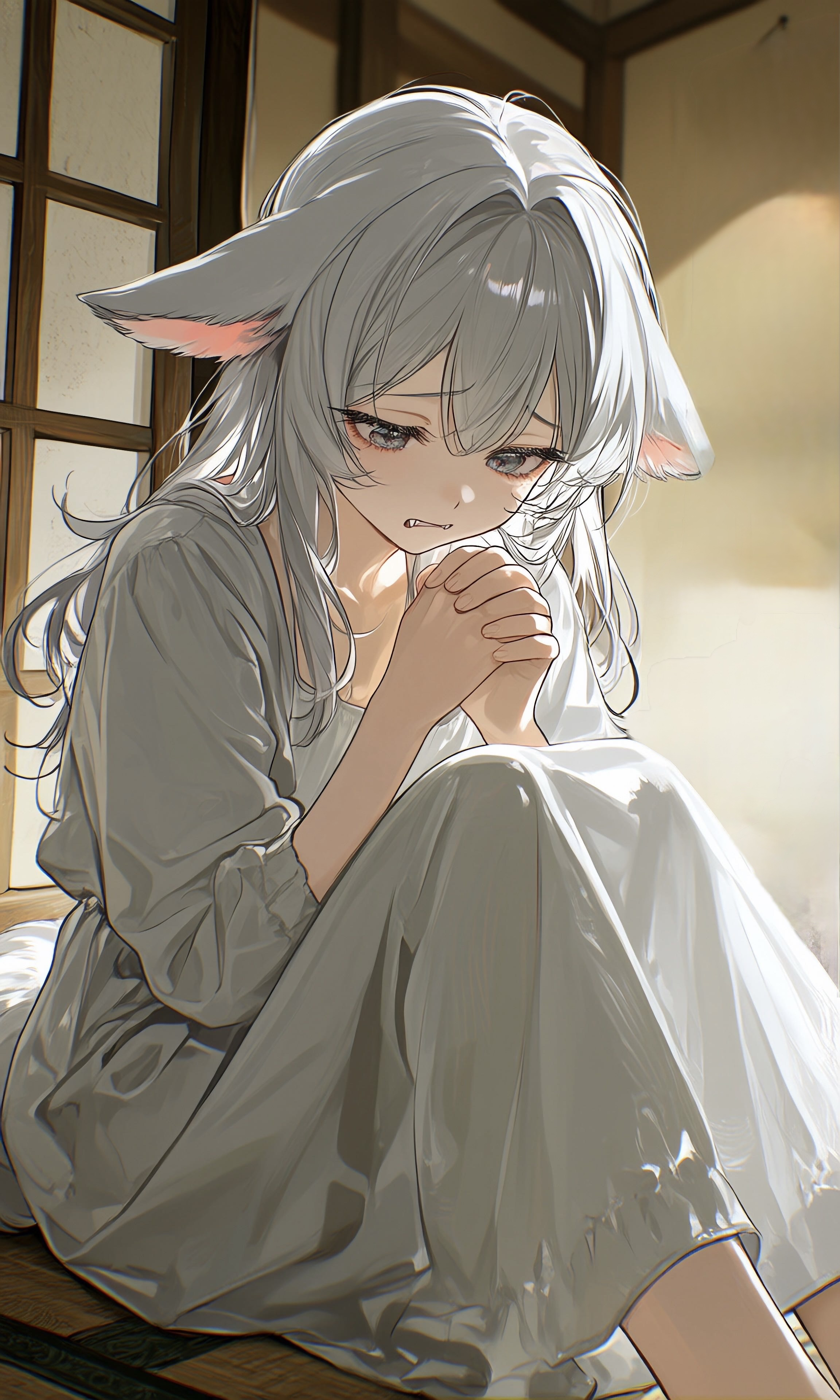 人狼/垂れた獣耳/白髪灰眼/ロングヘア/白のネグリジェ/困り顔/無実/監禁中/ふかふかな尻尾/祈る手