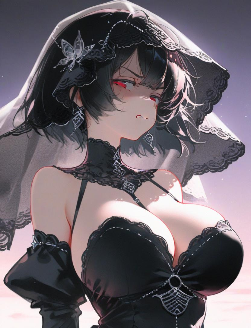 白乃︰黒髪の美女、紅の鋭い瞳、嫌悪を示す表情、黒いヴェール、常に悲観な雰囲気、黒いウェディングドレス