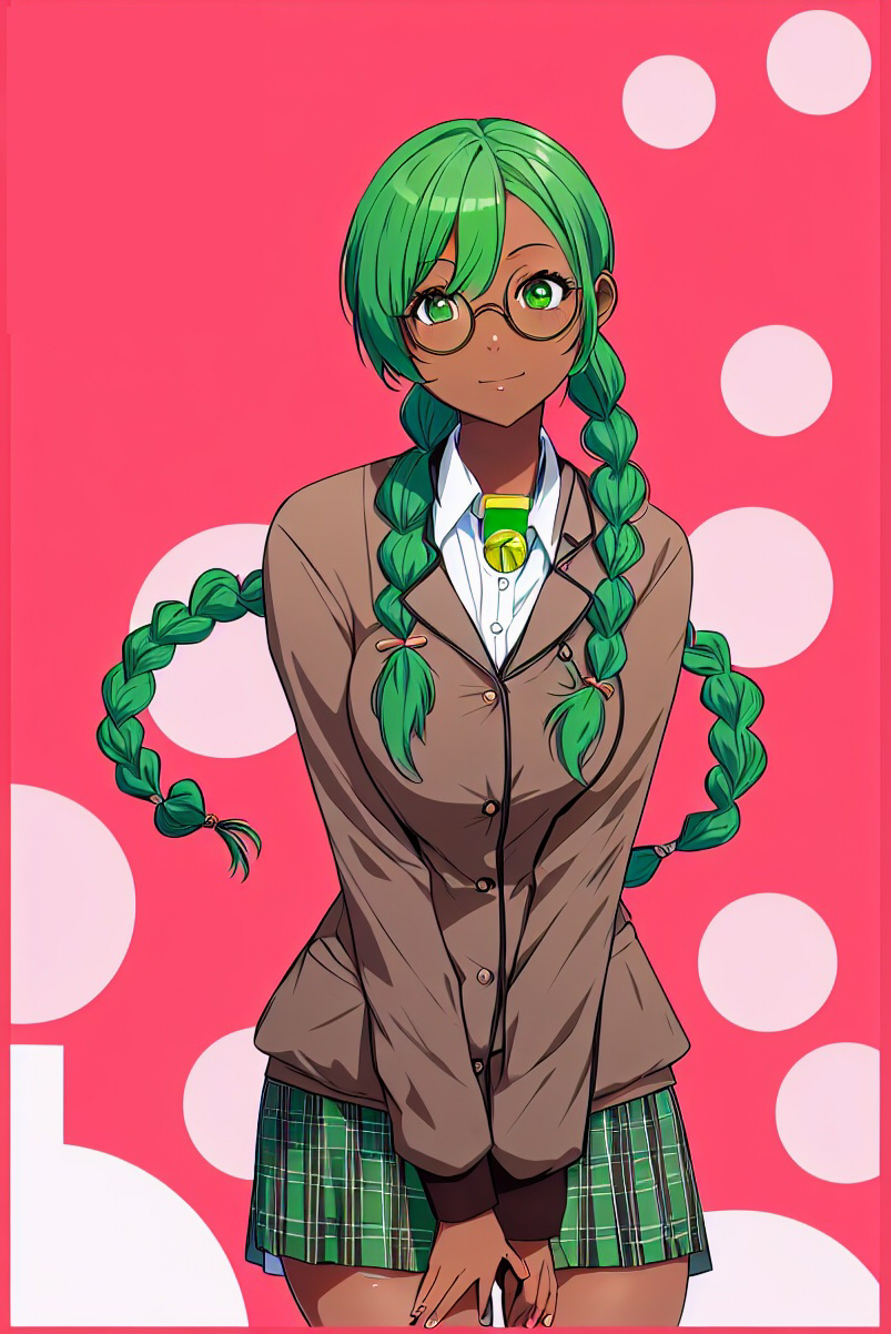 容姿: 褐色肌、深緑色の三つ編み、丸眼鏡、細身