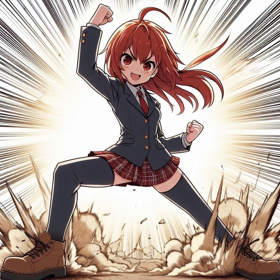 赤髪アホ毛/容姿: 締まりのない顔 蹴り技用頑丈スニーカー