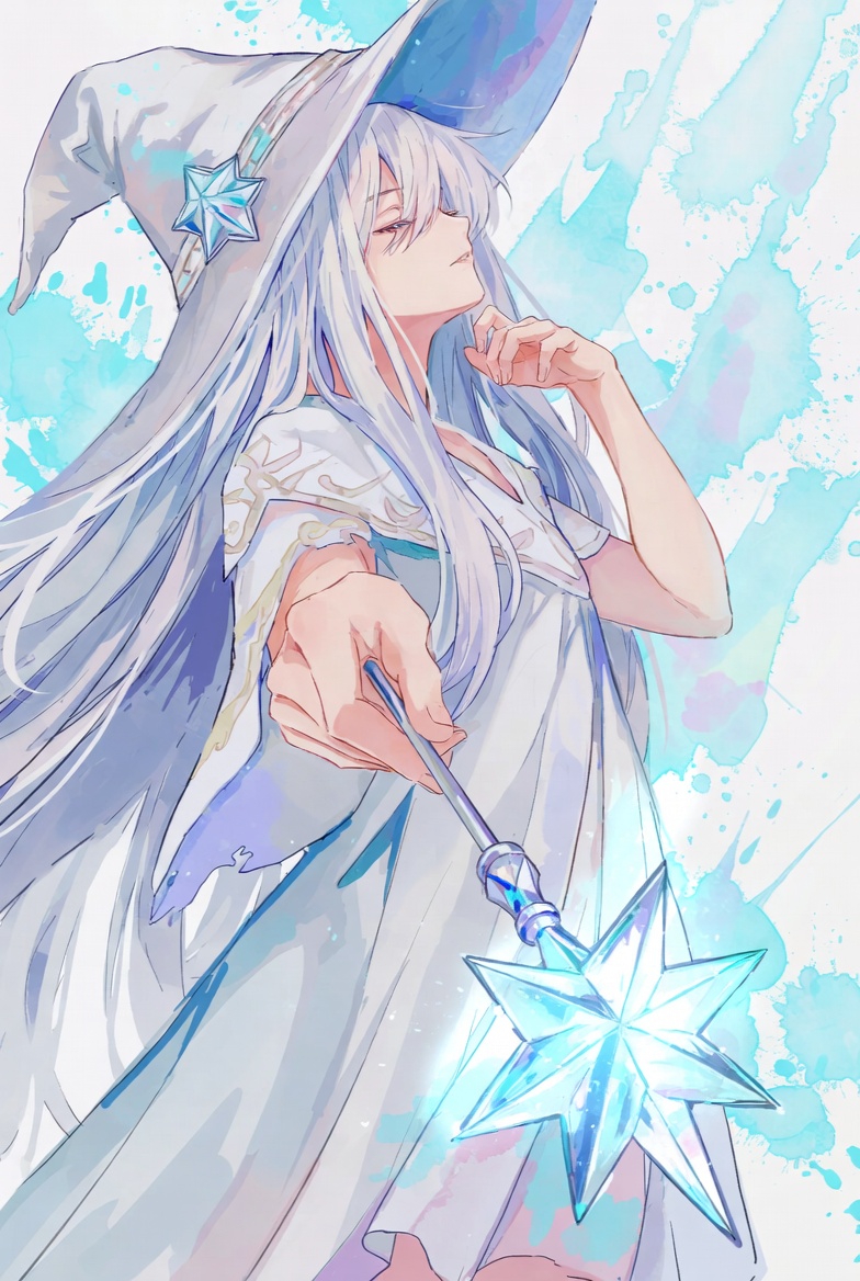 容姿:女性の人間: 長白髪/白の魔法使い服/白のとんがり帽子