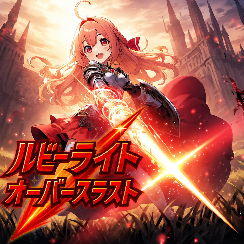【ルビーライト・オーバースラスト】紅玉の輝きがランスの穂先へと極限まで収束。刹那、全身全霊の一閃が解き放たれ、紅蓮の光が天を切り裂き、昇りゆく