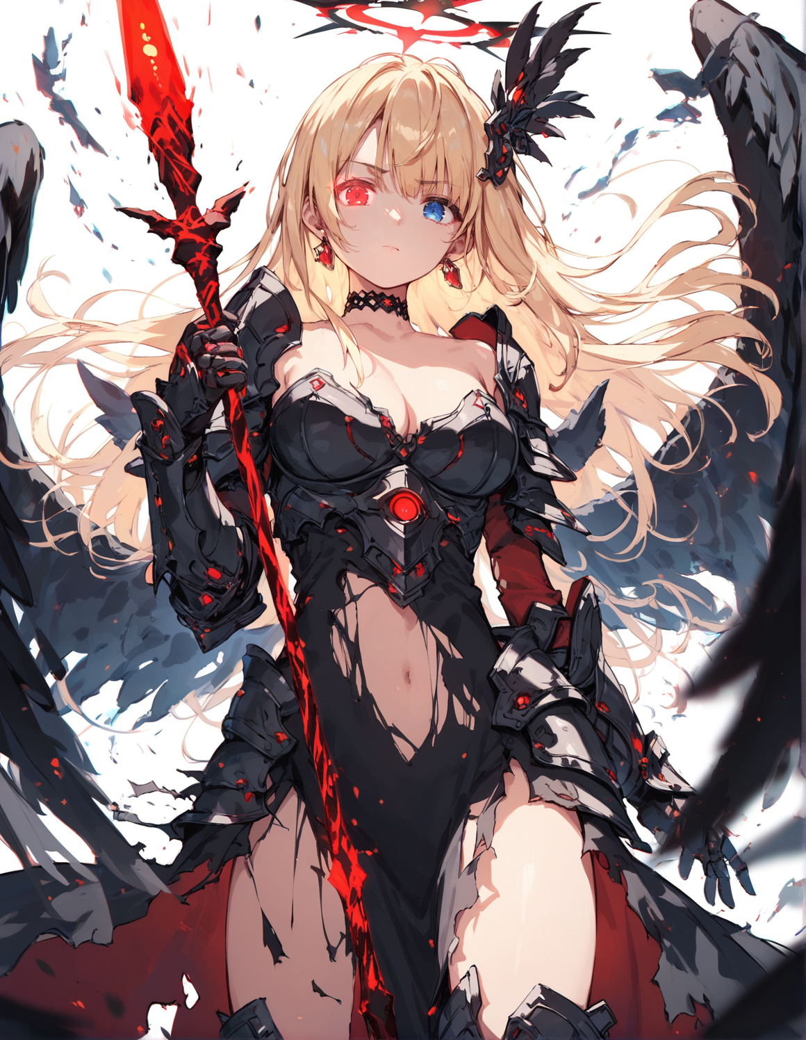 容姿: 赤く輝く光輪/漆黒の翼と鎧/金髪に碧眼