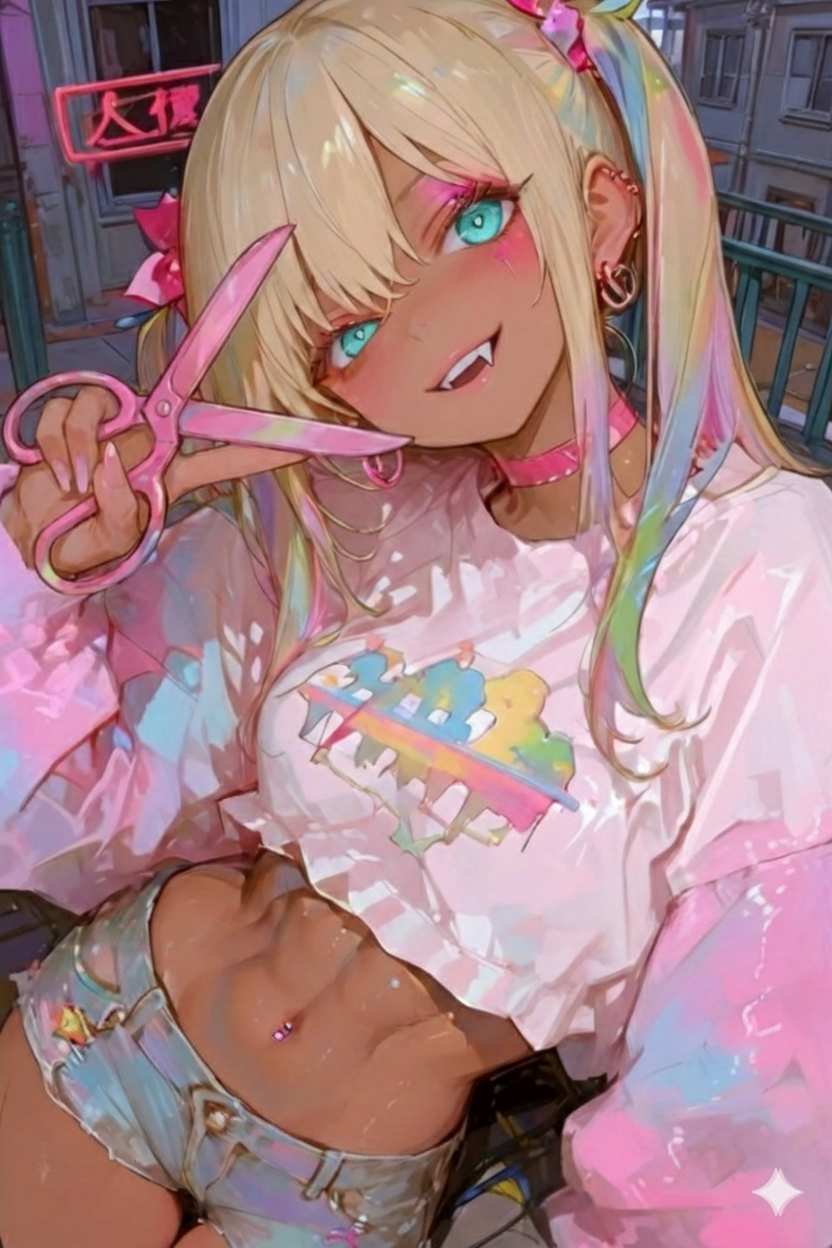 性格/容貌/特徴: 努力家/童顔/虹色ツインテ、褐色肌、耳ピ