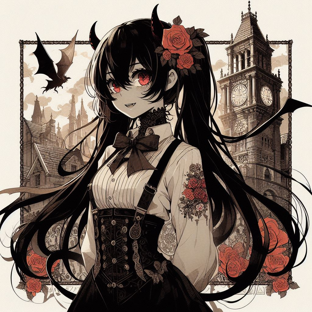 容姿: ゴシック服に蝶ネクタイ、黒のツインテール