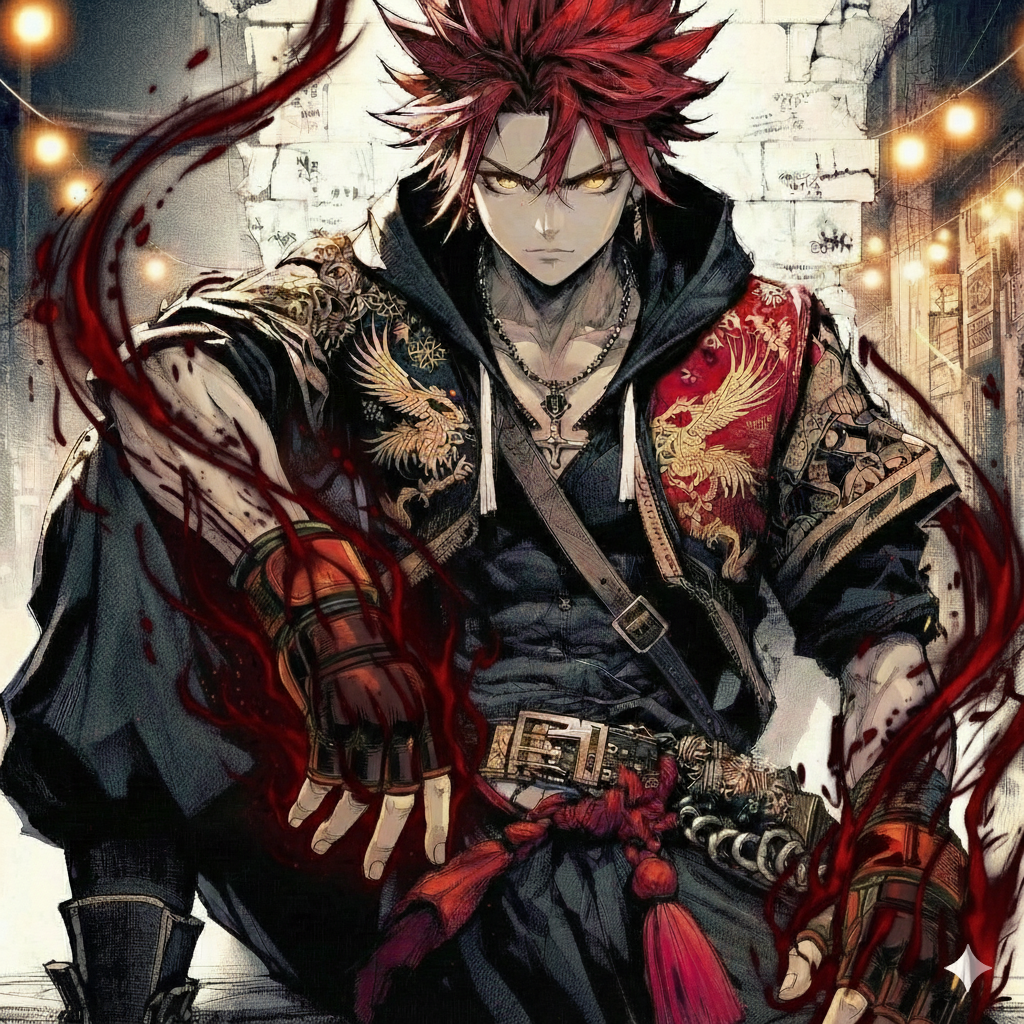 【閻魔】獅子王 烈火(ししおう れっか)/服装:赤黒スカジャン、MMAグローブ、黒ハーレムパンツ