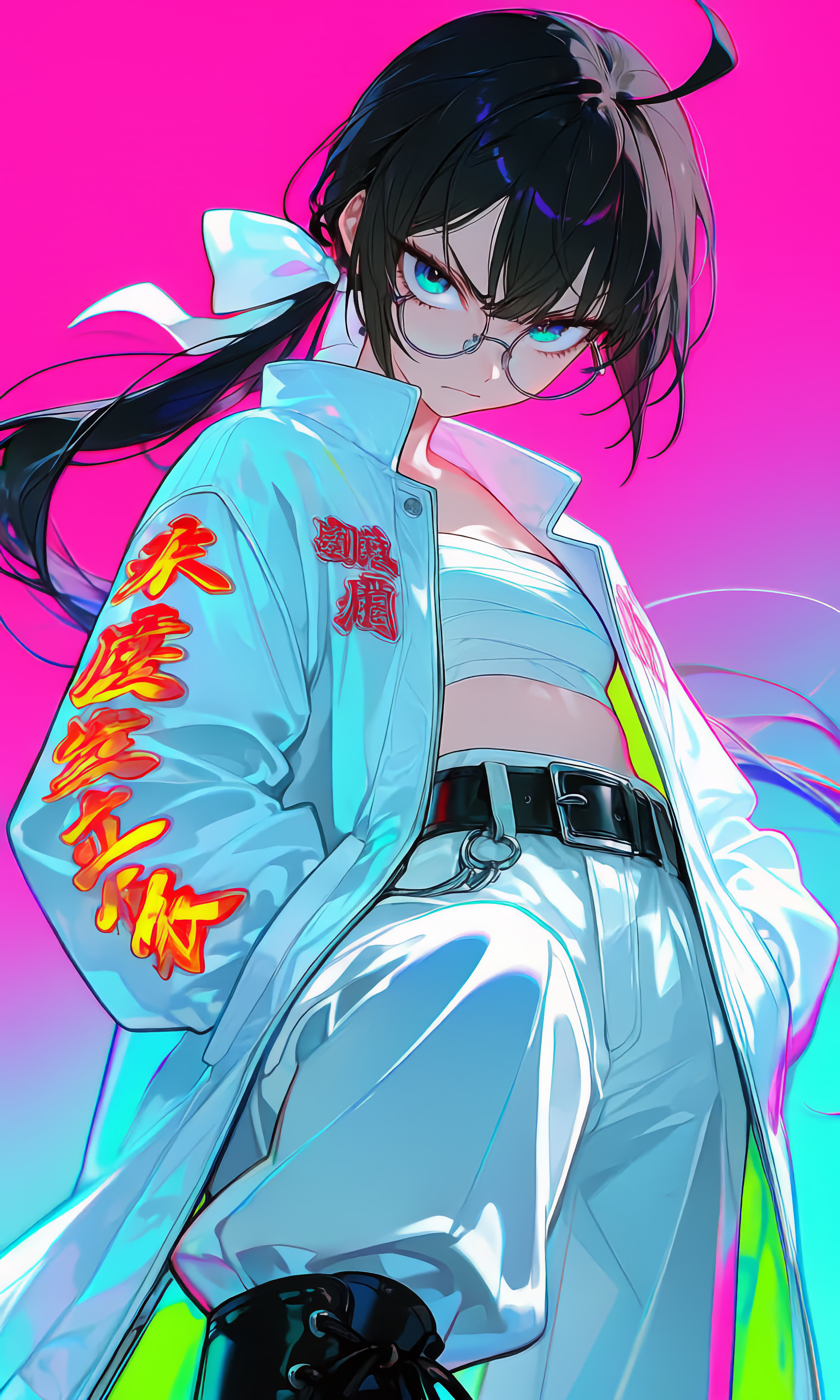 膝下暴羅(ひざもと あばら)/眼鏡/黒髪ポニーテール/白いリボンで髪をまとめている/白い特攻服/晒し