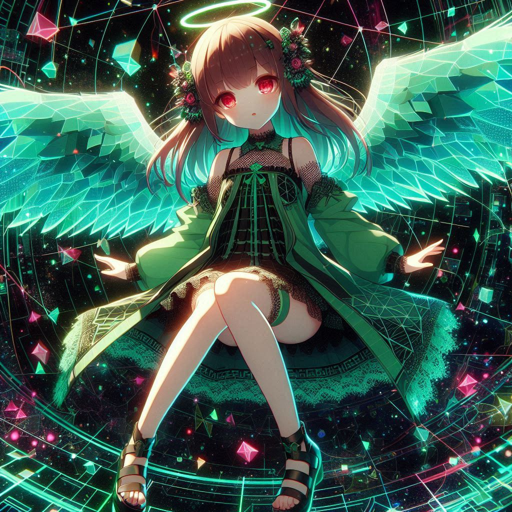 果て無き演算者: 女性,緑衣,電子化された翼,浮遊