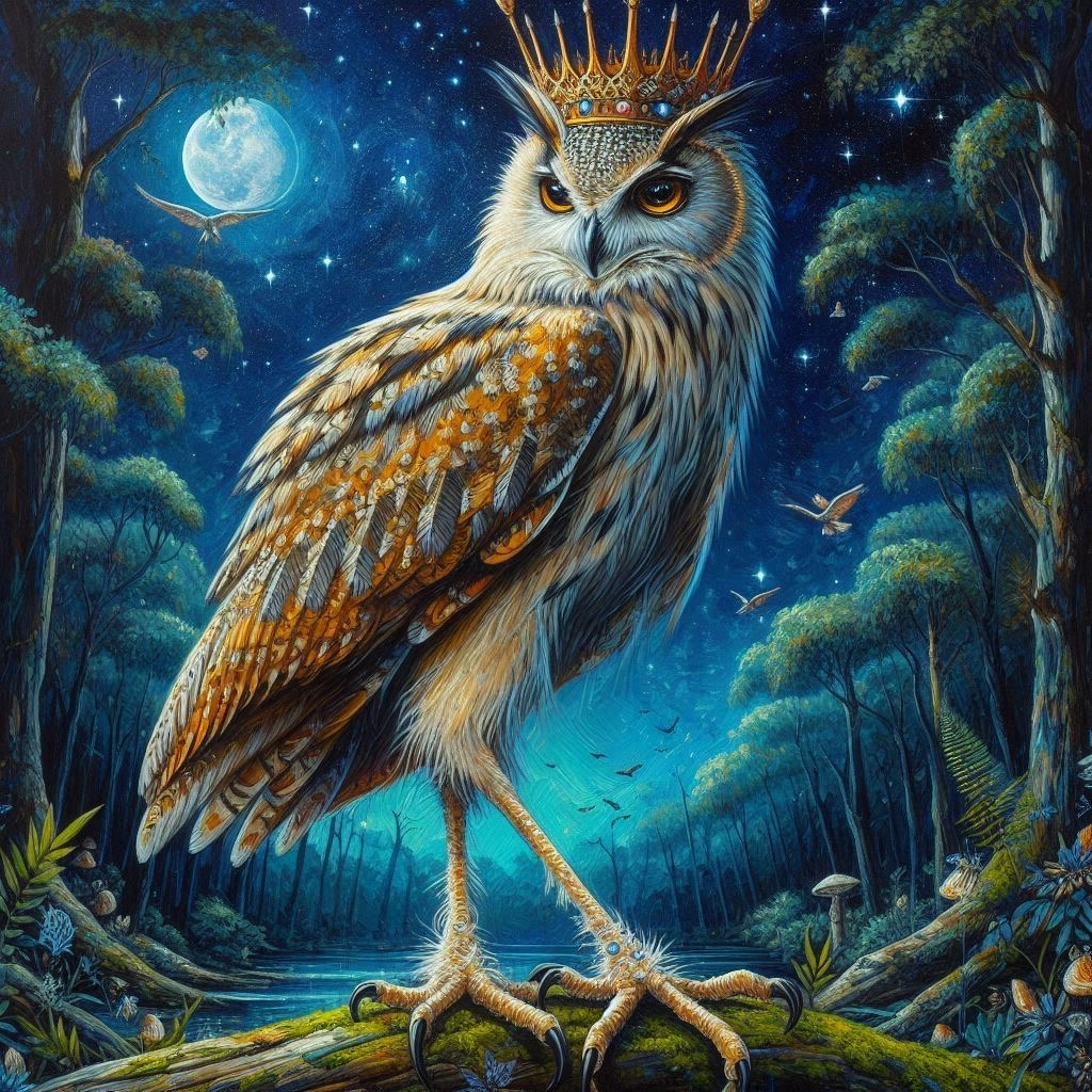 自分は聡明な梟: 偉大な君主 脚が長い 頭に王冠 徳量寛大