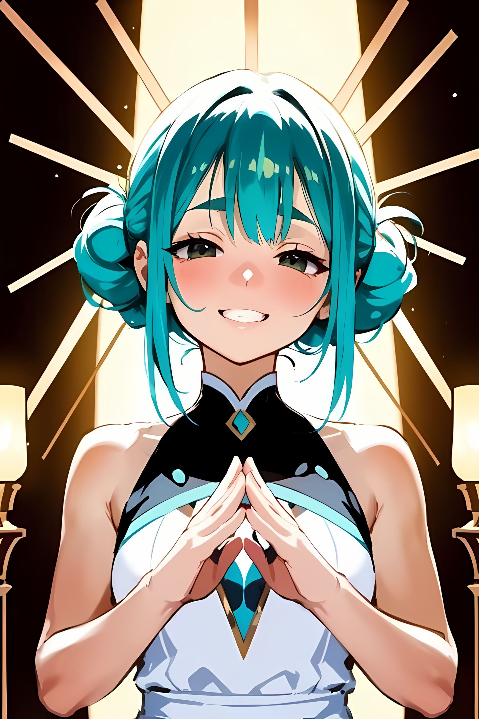 ニッコリ笑顔、垂れ目、垂れ眉、美少女、緑髪黒眼、ツインシニヨン(髪の両サイド中国結び)、聞き上手、同情的、話し上手、会話上手。