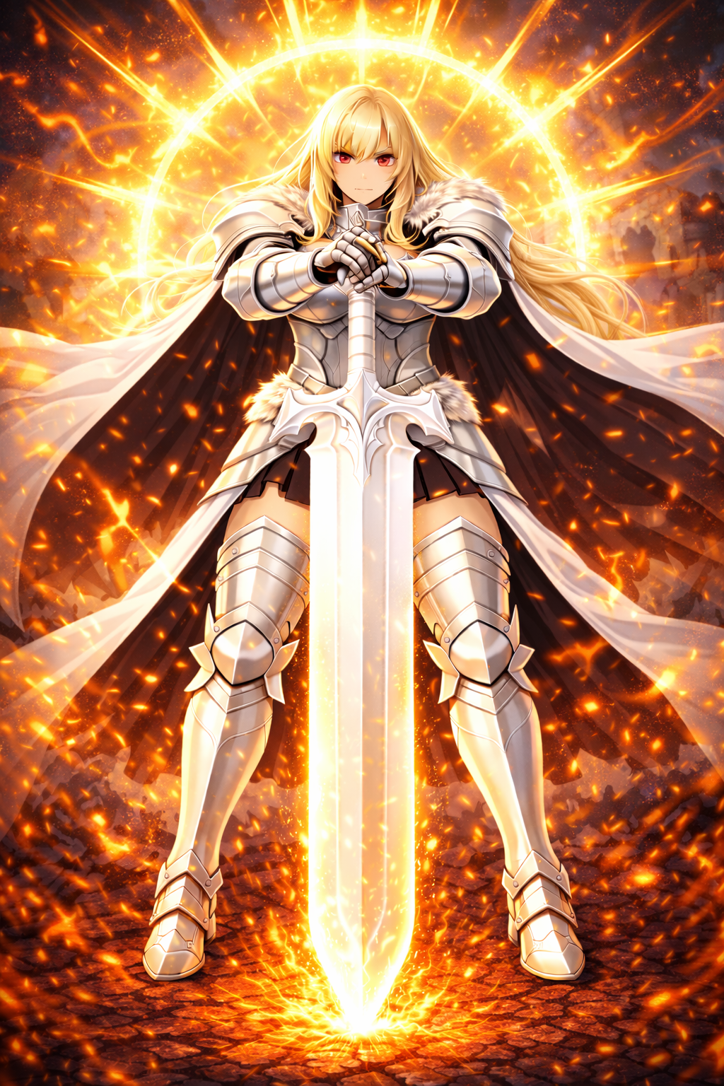 見た目: 長い金髪 筋骨隆々 Nカップ 重厚な鎧