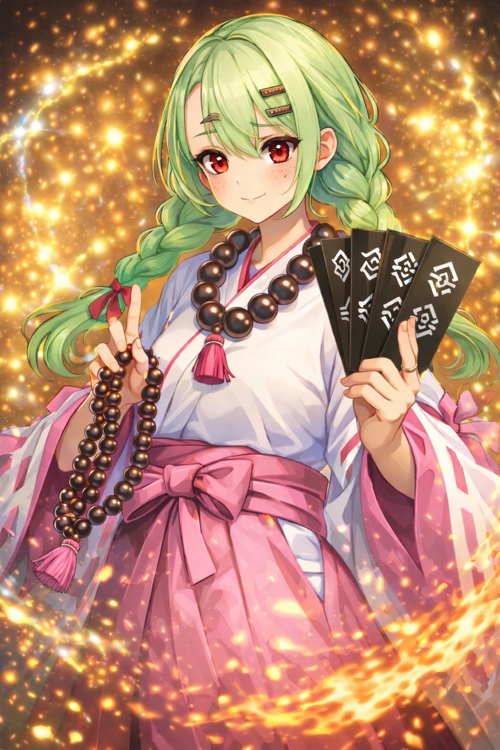 特徴②: 緑髪おさげ、桃色と白の巫女服、数珠と護符