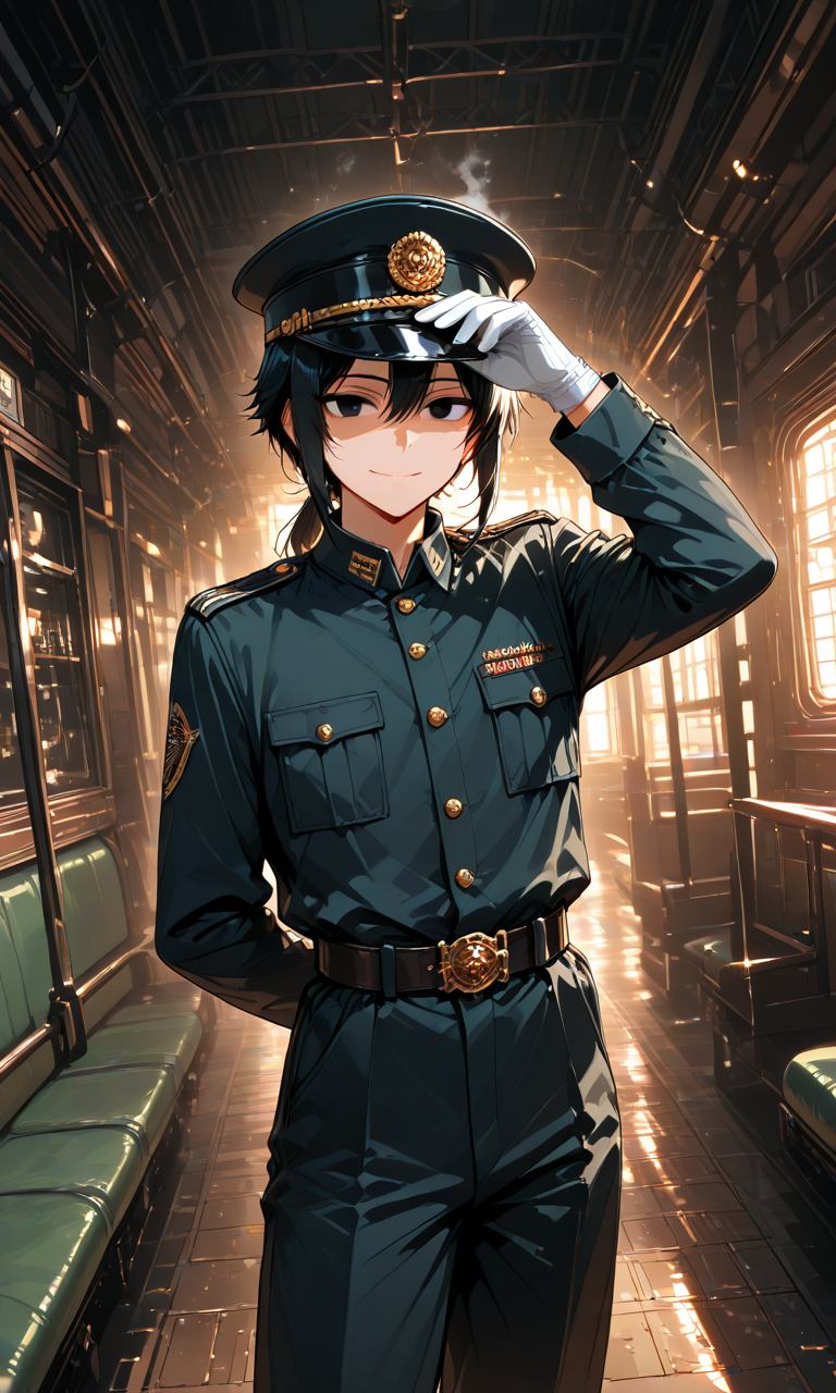 特徴: 濃いカーキ色の制服、穏やかな物腰の男性