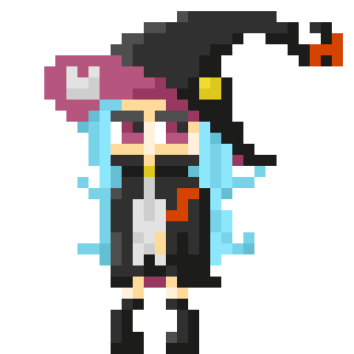 容姿: 少女、安っぽい装飾の魔女のマントと帽子