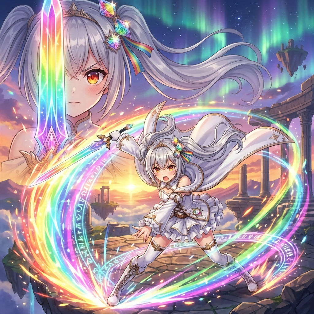 【ノブルオパール・イーリスブライト】パーソナルジェムのオパールの力を極限解放。七属性と共鳴せし剣に、正義の虹光が収束する。やがてその虹の輝きは世界を七色に塗り替える『極光』の斬撃となり、天地を貫き尽くす。