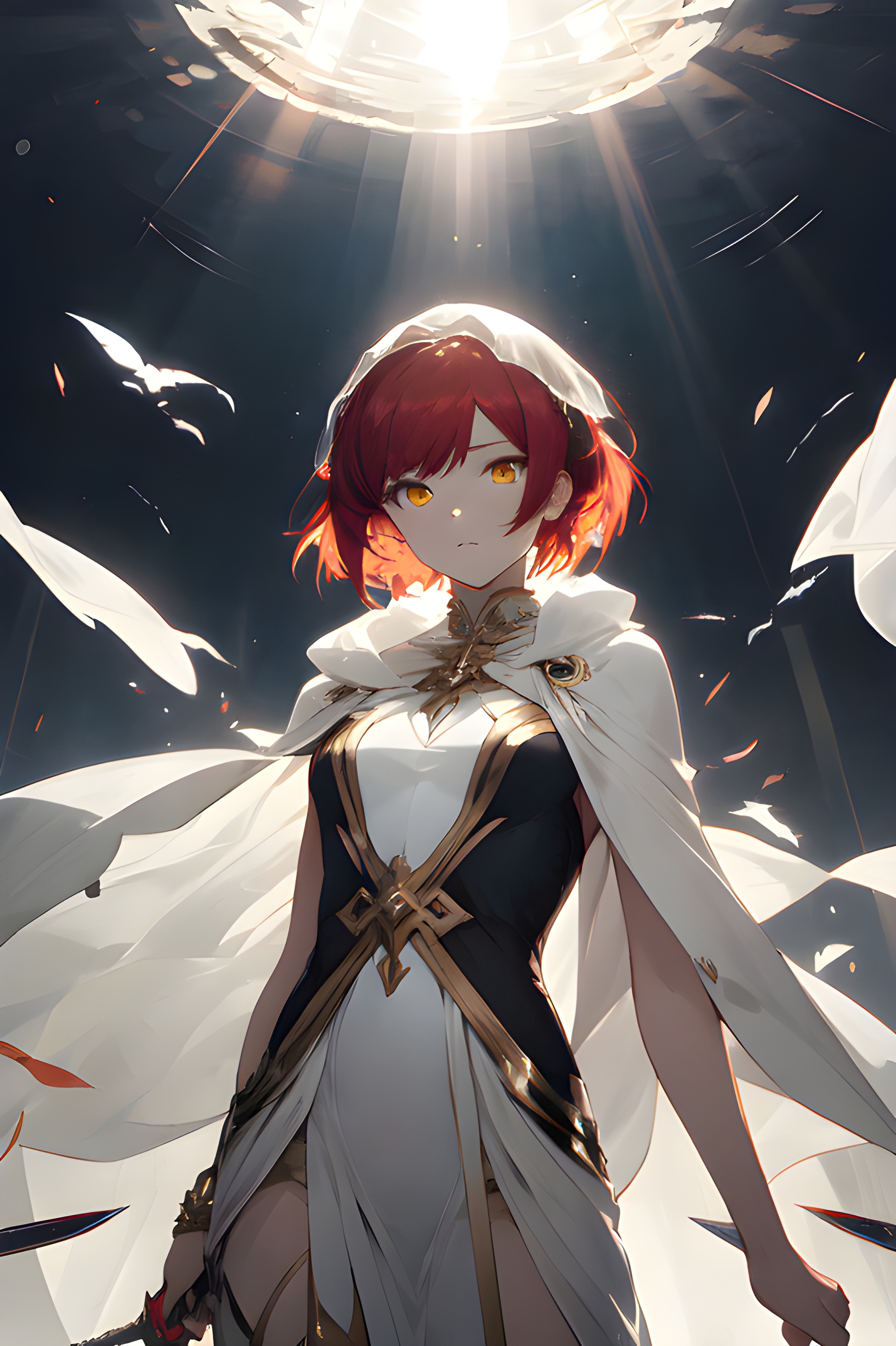 自分の容姿: 赤髪/黄瞳/白を基調とする女神服