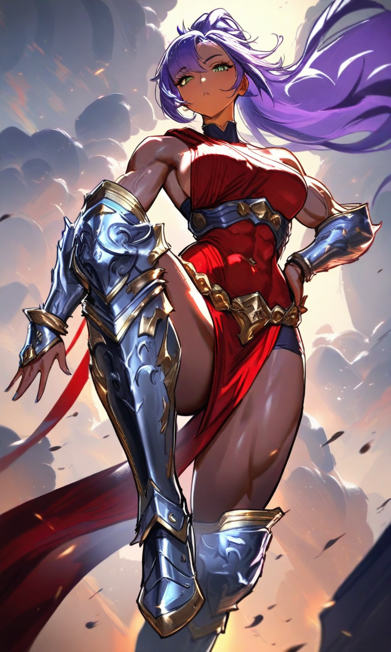 容姿: 紫のポニテ、褐色肌、筋骨隆々な1.8m